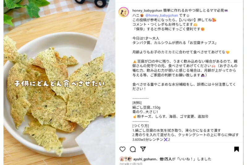 現在、Instagramで手づかみ食べのレシピを発信しているハニさん。最も反響が大きかったのは「豆腐チップス」でした。