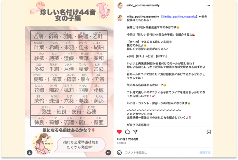 Instagramでの発信の中で、最も反響が大きかったテーマは「名付け」でした。